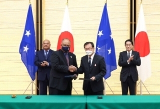 On February 2, 2023, in Tokyo, H.E. MICHIGAMI Hisashi, Ambassador Extraordinary and Plenipotentiary of Japan to the Federated States of Micronesia, and T.H. Kandhi A. Elieisar, Secretary of Foreign Affairs of the FSM, signed and exchanged notes concerning 300 million yen in grant aid to the FSM for "Economic and Social Development programme" in the presence of H.E. KISHIDA Fumio, Prime Minister of Japan, and H.E. David W. Panuelo, President of the FSM.