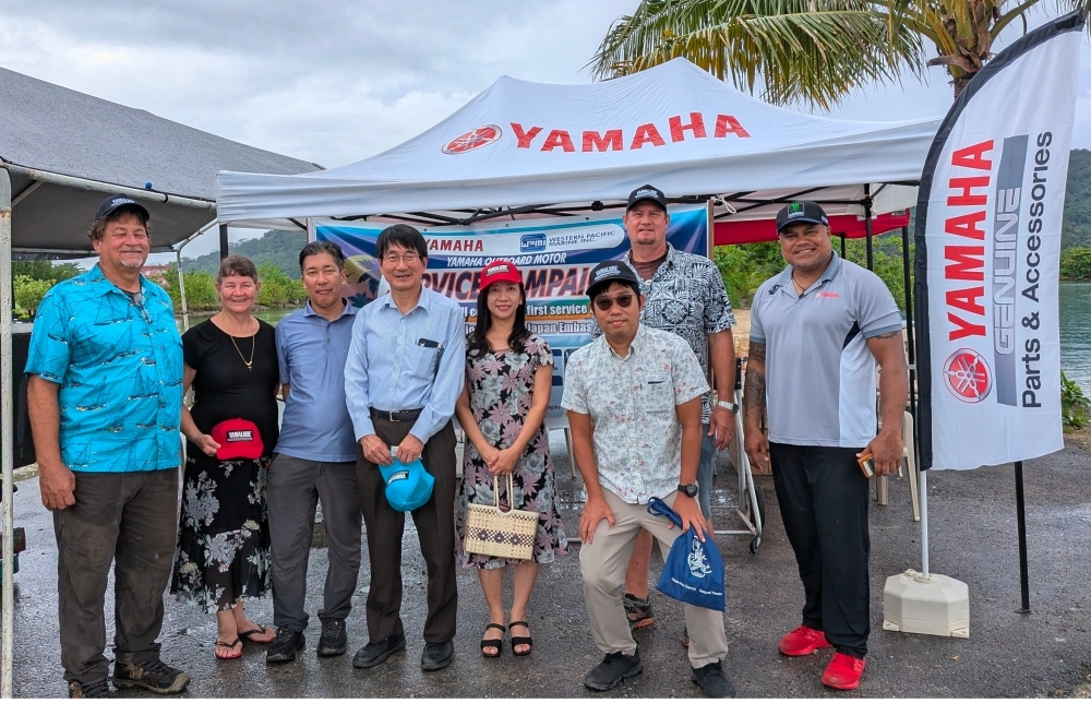 9月12日、籠宮大使は、日本のヤマハ発動機株式会社がミクロネシア連邦ポンペイ州で実施した、船外機ユーザーを対象としたサービスキャンペーンを視察しました。本キャンペーンはチューク州及びポンペイ州で実施され、エンジンの無料点検及び模造品の見分け方や日常的なメンテナンス手法の指導、オイルやパーツ等のディスカウント販売などが行われており、ときおり雨も降る中、次々に船外機ユーザーが訪れていました。
