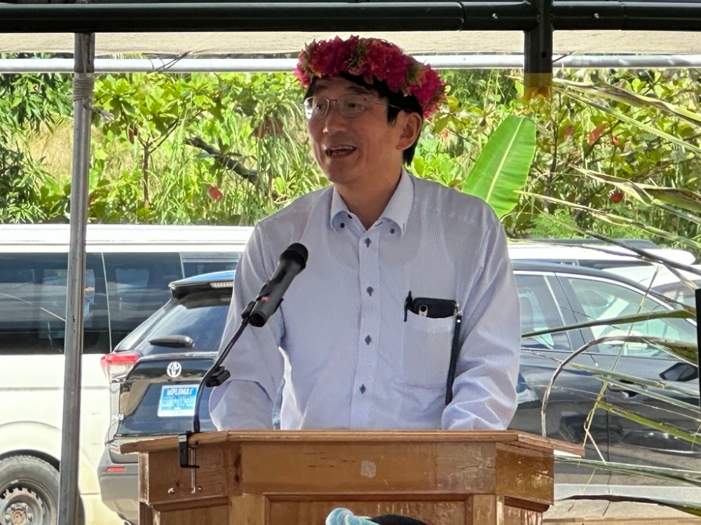 籠宮大使はスピーチの中で、日本とミクロネシアとの間で長年にわたり育まれてきた「キズナ」(友好関係)に触れ、今回の支援が、安全性及び物流の改善に加え、人々の交流の増加や地域経済の活性化及び地域住民の生活水準の向上に寄与し、地域全体への持続可能な利益をもたらすことを期待すると述べました。更に、プロジェクトを実施する日本国際協力機構(JICA)及び若築建設株式会社により、日本の技術と経験が最大限に活用されることを望んでいるとし、工事の成功への期待を述べました。