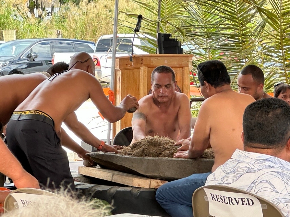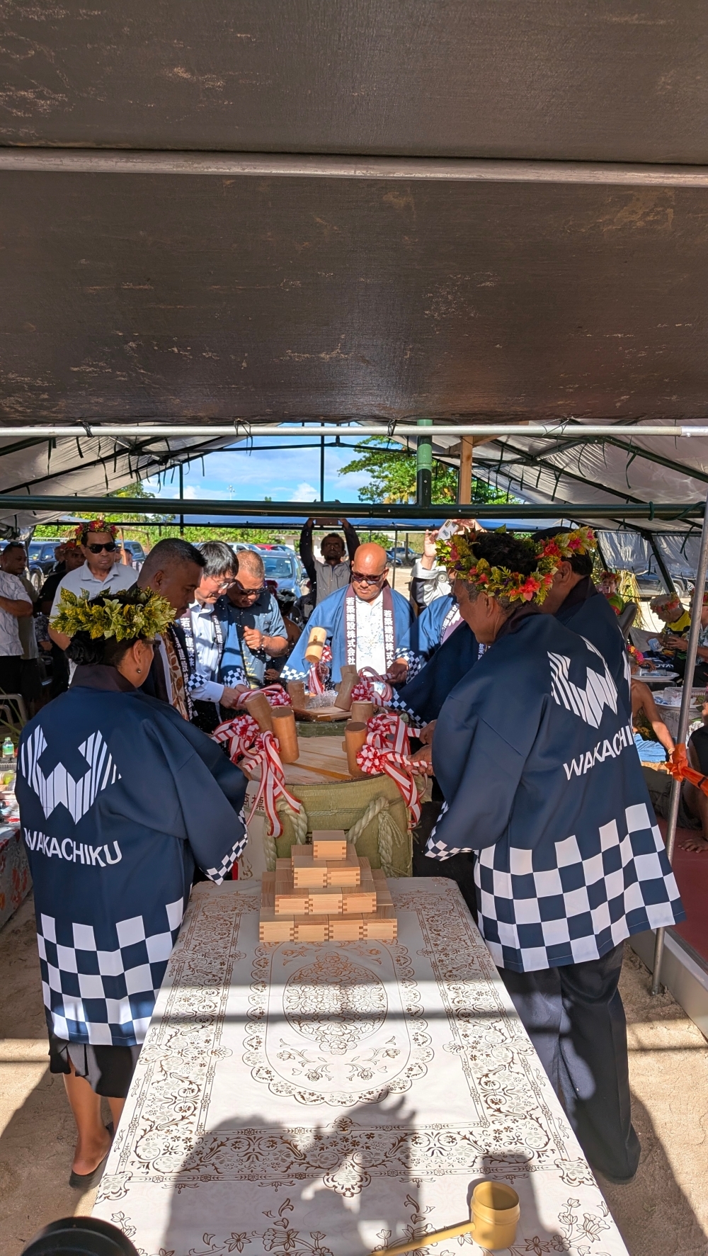 起工式では、ミクロネシア伝統のサカウセレモニーのほか、日本の酒セレモニーとして鏡開きが実施され、参加者に日本酒が振る舞われました。