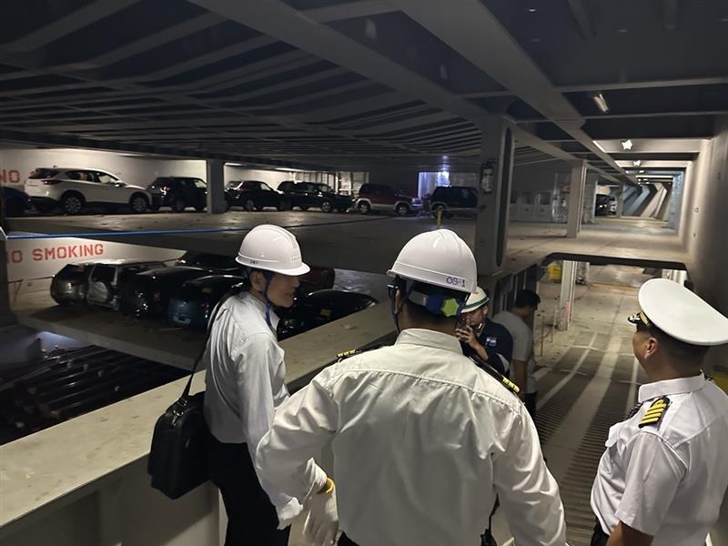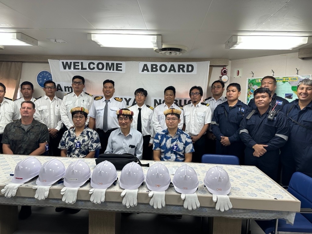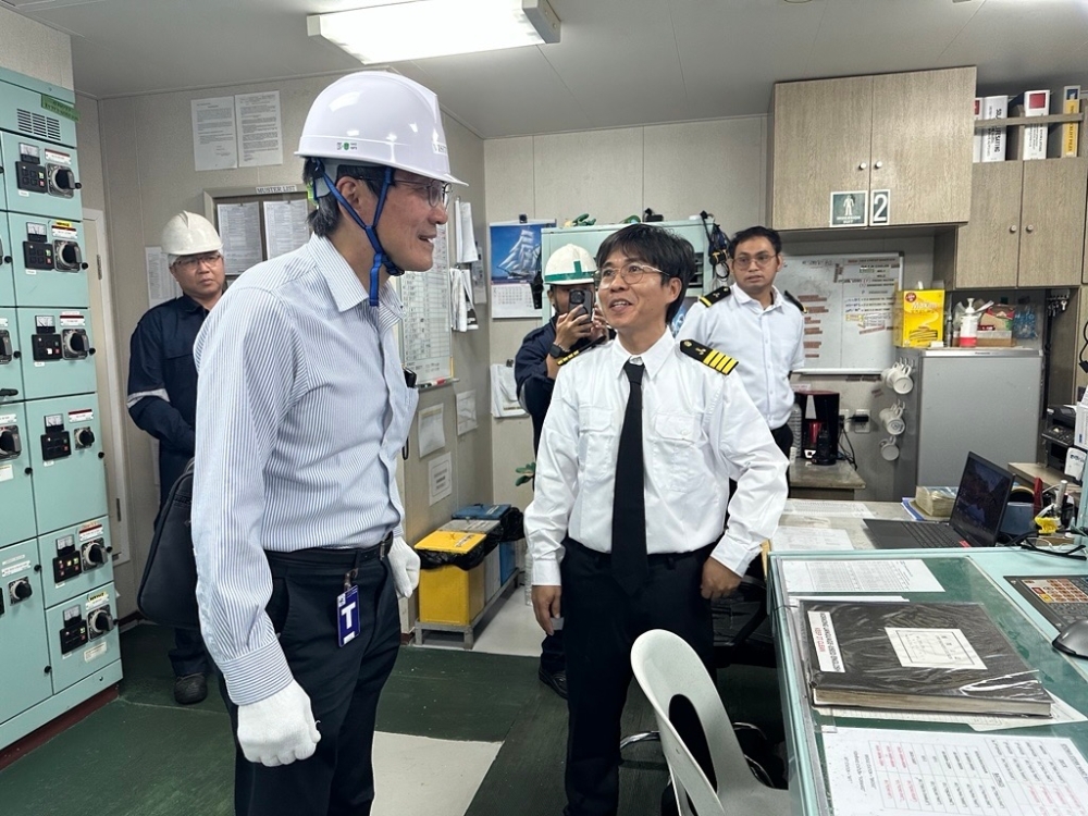 10月2日、籠宮大使は、ミクロネシア連邦(FSM)ポンペイ港に寄港中の協和海運貨物船「Kyowa Stork」を訪問しました。本船は、多目的運搬船としてコンテナを積載している他、車両を自走で搭載するランプなどを有し、様々な貨物を搭載しています。籠宮大使は、本船の船長をはじめとする乗組員に歓迎され、貨物の荷役状況などについて説明を受けたほか、船内を視察しました。