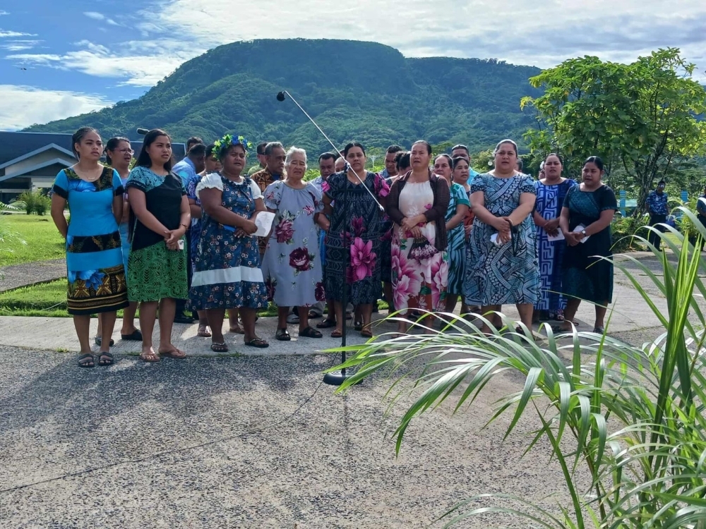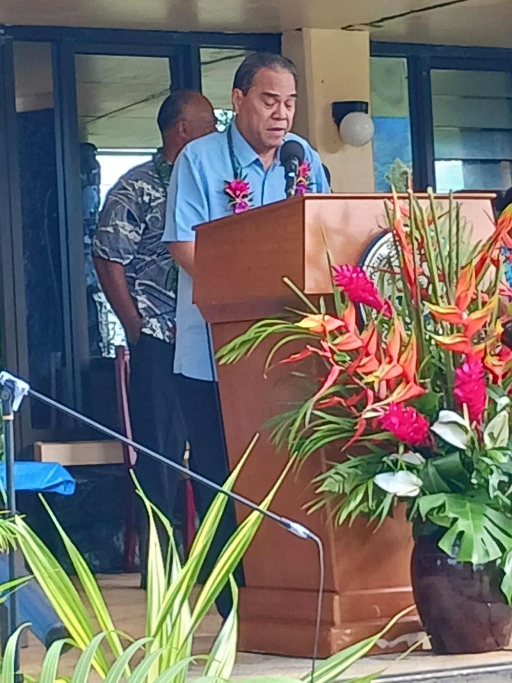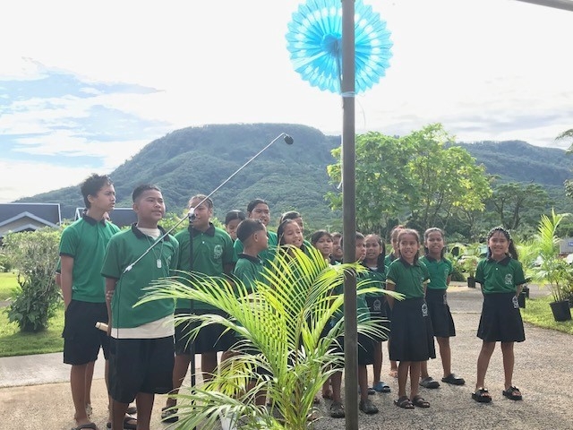 ミクロネシア短期大学合唱団の学生たちが国歌「Across All Micronesia」を斉唱し、その後、活気あふれるオーミネ小学校の学生たちによる合唱と、コスラエ州の人々による「Kampare」(がんばれ)の歌が披露されました。