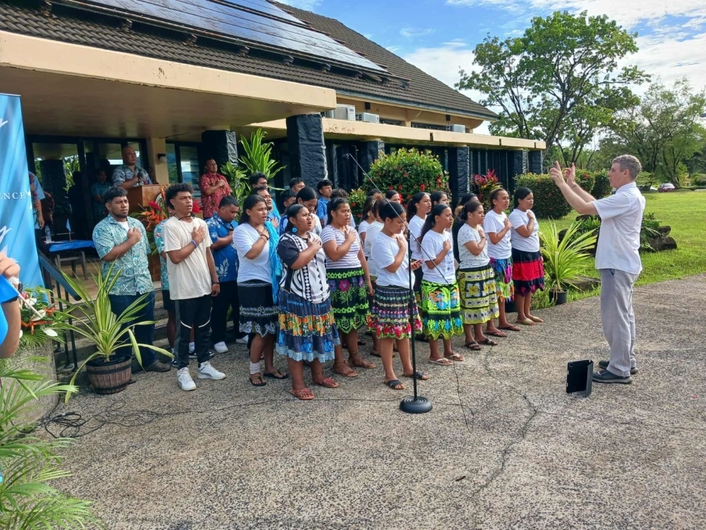 ミクロネシア大学合唱団の学生たちから国歌「Across All Micronesia」を斉唱