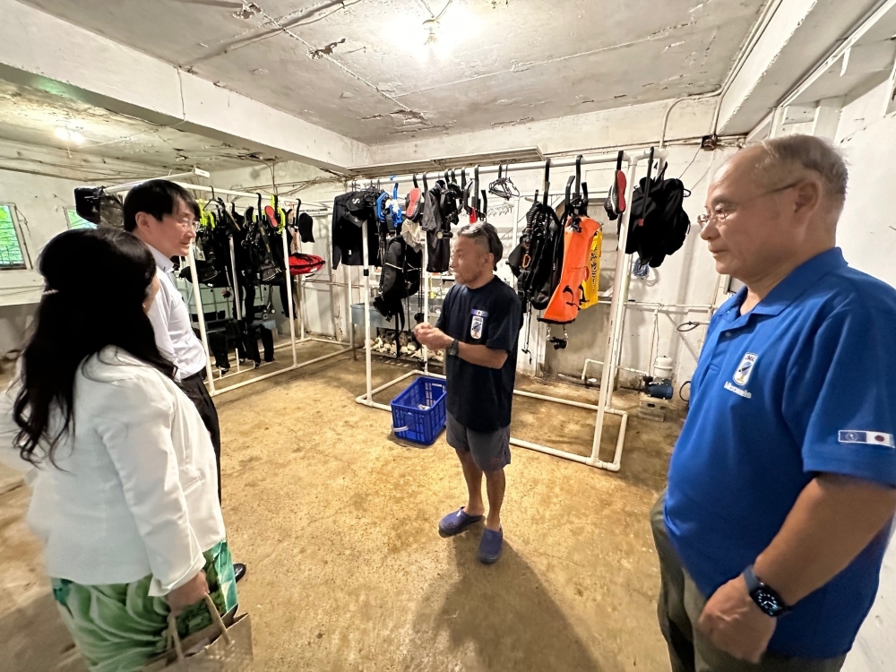籠宮大使はまた、日本地雷処理を支援する会(JMAS)の事務所を訪れ、内山哲也現地代表から、環境保護を目的としたチューク環礁の戦没船からの油回収プロジェクトについての報告を受けたほか、船舶からの油回収方法を視察しました。