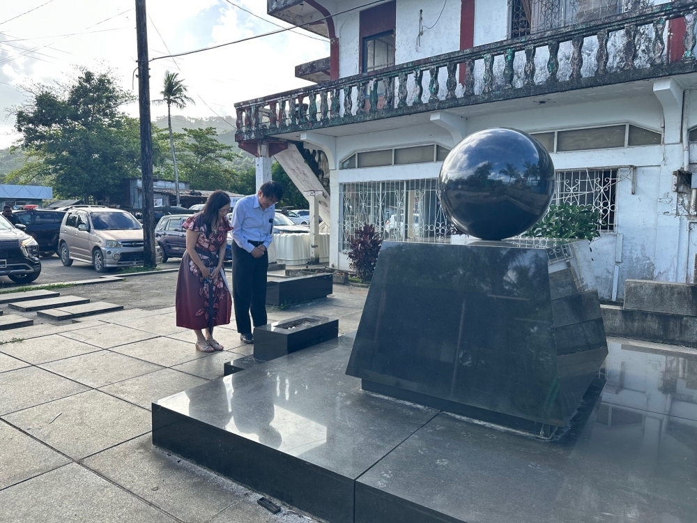 Ambassador and Mrs. Kagomiya also visited the monument erected in memory of the war dead to pray for those who perished during the war in Chuuk (Truk island).