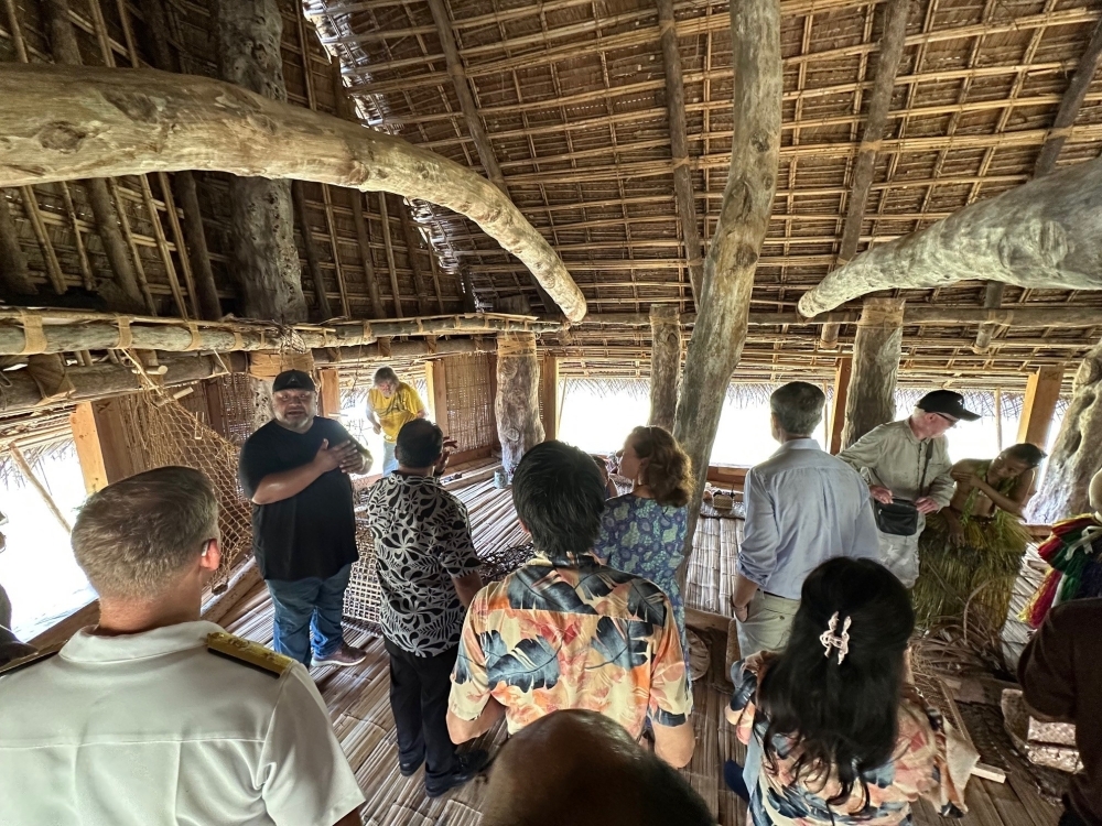 伝統的な集会所の中で漁法などについて説明を聞く籠宮大使夫妻