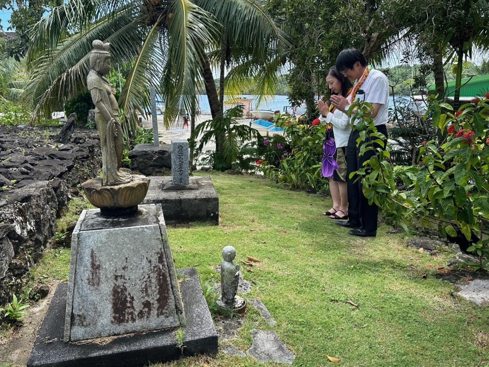 籠宮大使はまた、太平洋戦争の際にヤップで亡くなられた人々を追悼するために建てられた慰霊碑を訪れ、戦没者に祈りを捧げました。