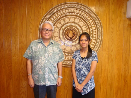 3月5日(水)に2014年度文部科学省国費留学生として選ばれたクリスティーナ・トウコ・シゲタさんが鈴木大使を表敬しました。表敬の際、鈴木大使は、太平洋島嶼国から選出された数少ない国費留学生としてクリスティーナさんに専攻科目だけでなく日本の文化、生活習慣も含めたくさんのことを学んで来てほしいと激励しました。それに対しクリスティーナさんは、日本に一人で行くのは初めてで不安もあるが、一生懸命頑張りたいと話しました。
