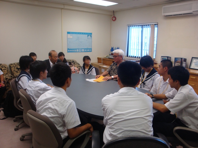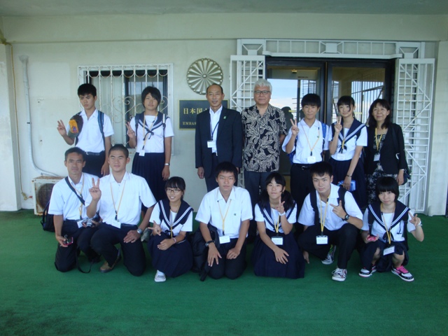 愛知県の江南市立宮田中学校から生徒10名と飯沼校長を含む引率4名が大使館を訪れ、鈴木大使と面談しました。鈴木大使は生徒たちに対し、ミクロネシアと日本の深い歴史的な繋がりについて説明し、今日でも「ヤキュウ」や「ウンドウカイ」などの日本語が使われており、短期間であるが、ポンペイの人々及びこの国のことを学んでほしいと話しました。